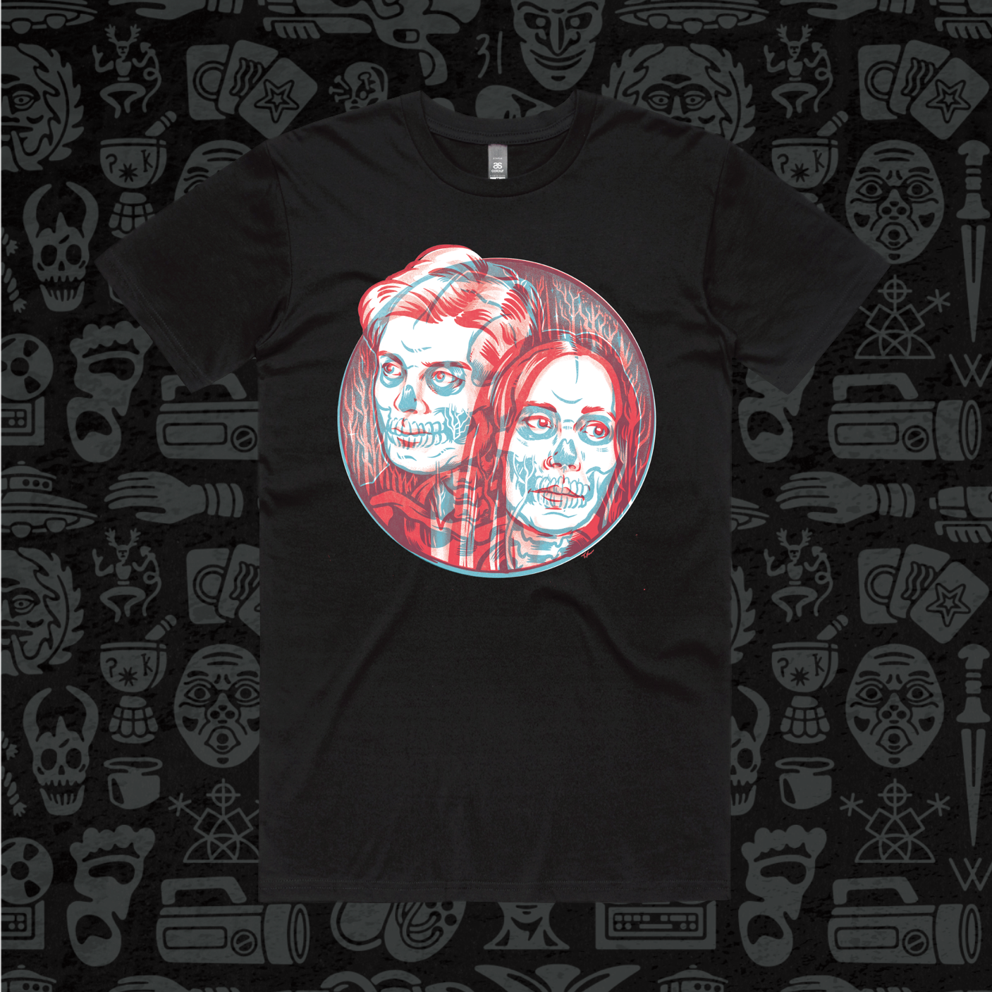 Our fearless hosts and curators featured in an original design from the incomparable Travis Knight! During the day, the 3D layered skeleton effect stands out as bold and unique. But at night is when this shirt really shines, with the blue skeletons taking on a life of their own with glow-in-the-dark ink.